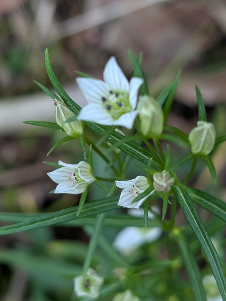 草丈20~25㎝、紫色を帯びた稜にある四角い茎が枝分かれして、根生葉は小形で茎にまとわりついた皮針形、茎葉は対生し、広線形で鋭頭、全縁。初秋に枝先と葉えきに紫色の線の入った白色の5弁花を多数円錐花序につけます。