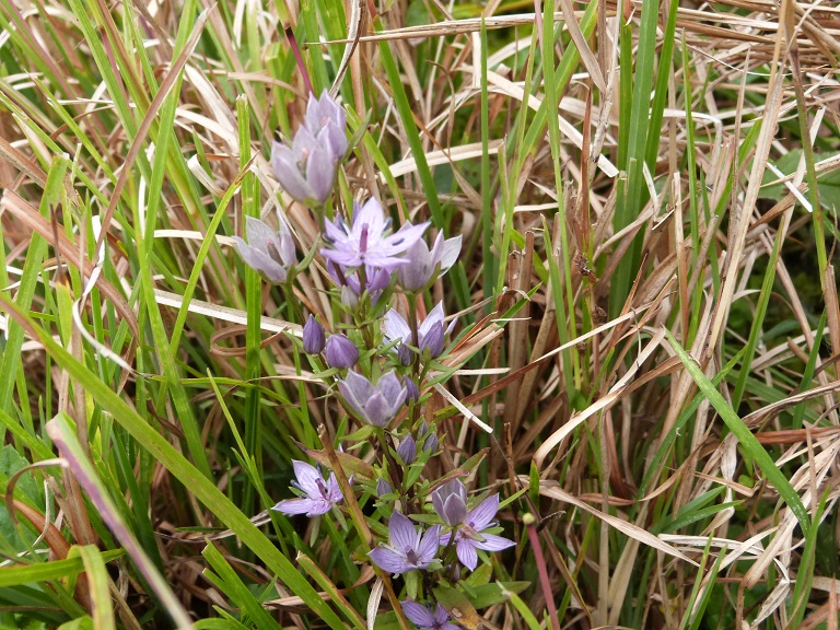 そして、とうとう出会うことが出来た。永年の恋人センブリの花に。その上、ムラサキセンブリの大きな株も満開。夢中で写真を撮って、渾身の一枚。